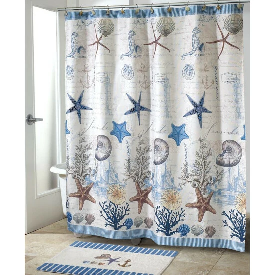 Bring a touch of old world charm to your bath space with this Antigua shower curtain from Avanti, featuring beautiful beaded & sequined shells surrounded by nautical & script motifs. Soft blue and natural tones finish the look for a refreshing presentation.