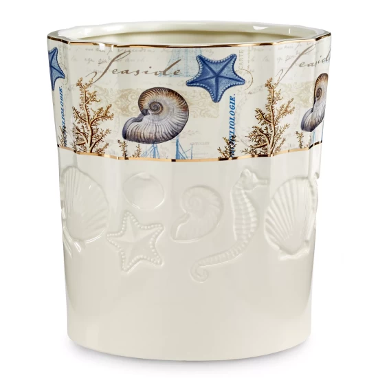 Bring a touch of old world charm to your bath space with this Antigua trash can from Avanti, featuring beautiful embossed shells with nautical and script motifs. Soft blue and natural tones finish the look for a refreshing presentation.
