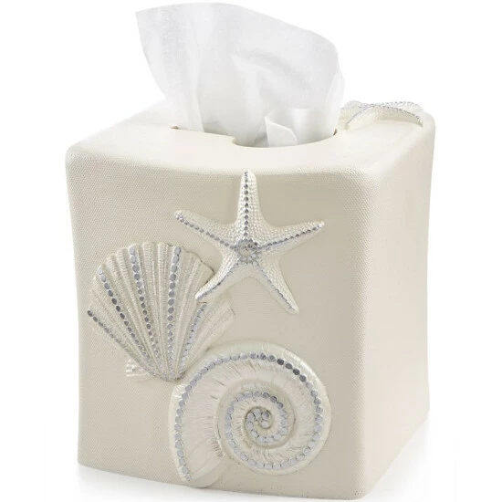 Evoke the coastal vibes of a beachy, seaside retreat with the Sequin Shells tissue cover from Avanti, featuring a raised seashell-inspired motif for an etherial display.