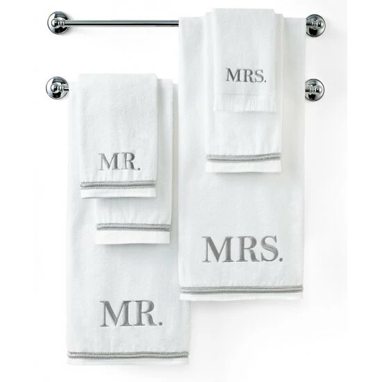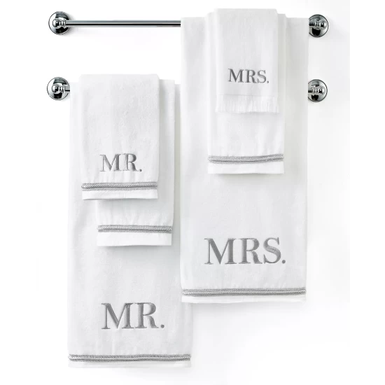 A great gift idea for any couple, especially newlyweds! These elegant towels feature Mr. and Mrs. embroidery in a lovely pewter hue with coordinating decorative trim.