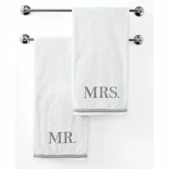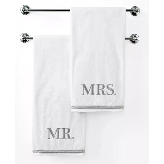 A great gift idea for any couple, especially newlyweds! This elegant bath towel features Mr. or Mrs. embroidery in a lovely pewter hue with coordinating decorative trim.