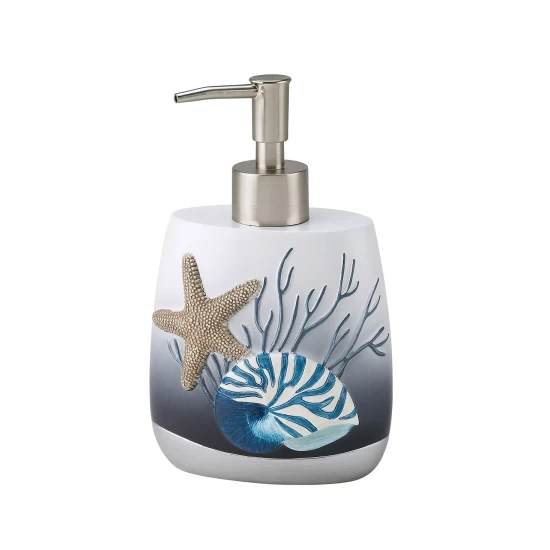 The Avanti Blue Lagoon Lotion Dispenser is decorated with raised starfish, shells coral in shades of blue beige on an ombre base that goes from off-white to dark blue. A contrasting silver border adorns the bottom.