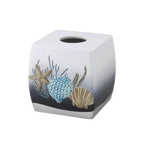 The Avanti Blue Lagoon Tissue Cover is decorated with raised starfish, shells coral in shades of blue beige on an ombre base that goes from off-white to dark blue. A contrasting silver border adorns the bottom.