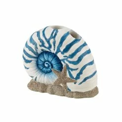 The Avanti Blue Lagoon Toothbrush Holder is a figural blue white striped nautilus shell with a starfish on a sand base. Perfect for the bathroom, kitchen or home office. Very useful to hold a variety of objects.
