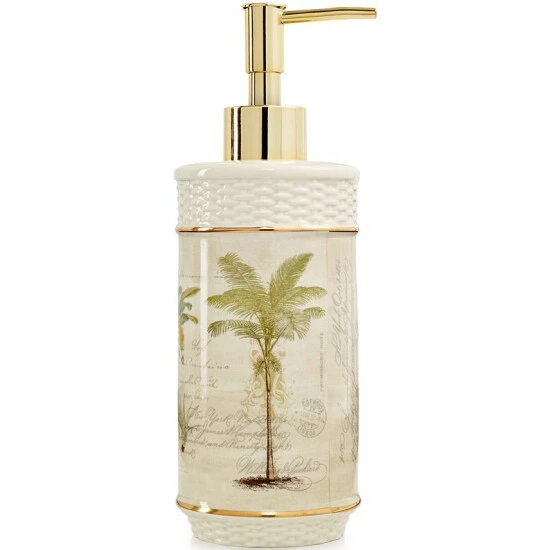 The tropical motif and soothing neutrals of lotion pump from the Colony Palm bath accessories collection brings stylish ease to your bathroom, featuring palm tree accents, script and textured details.
