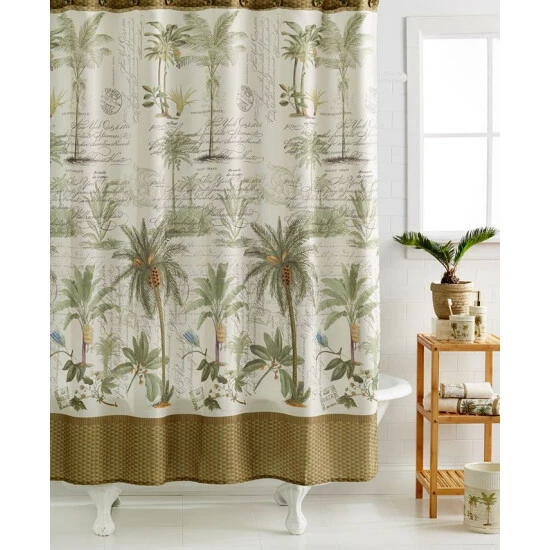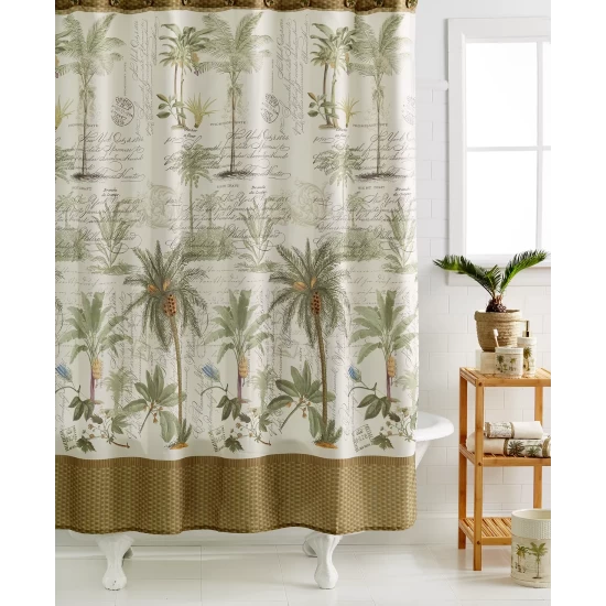 The tropical motif and soothing neutrals of the Colony Palm shower curtain brings stylish ease to your bathroom, featuring palm tree accents, script and textured details.