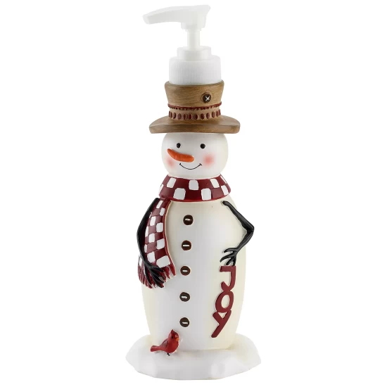 The Avanti Country Friends Lotion Dispenser is a figural, happy snowman with a carrot nose, burgundy scarf with white dots and a cardinal at its base. Adds the perfect holiday touch to any bathroom or kitchen.