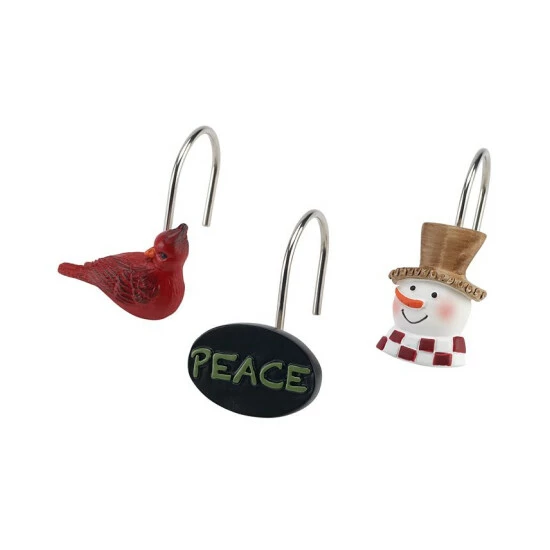 The Avanti Country Friends Shower Hooks features 3 icons from the shower curtain design-snowman, peace sign and cardinal to create the perfect finishing touch for the shower curtain.