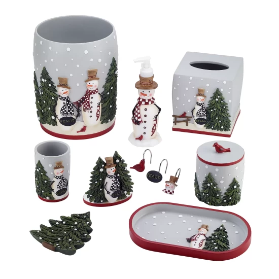 The Avanti Country Friends Tumbler is decorated with a friendly snowman with a black and white checked scarf holding a “peace” sign with a snowy pine tree on a grey ground. The bottom is trimmed with a coordinating red stripe.