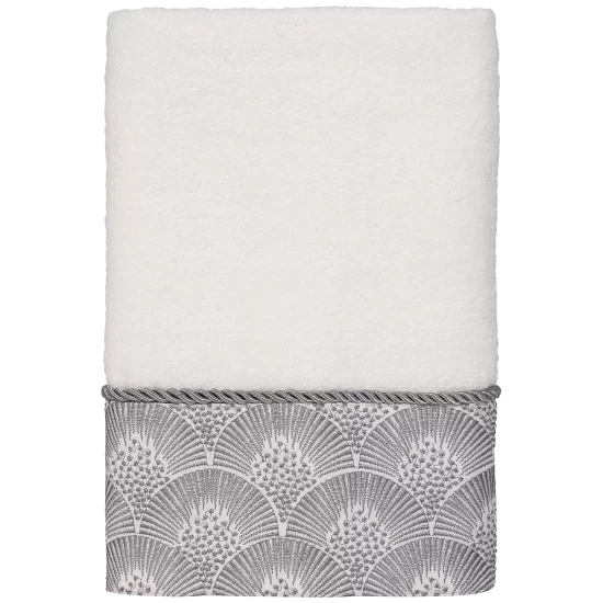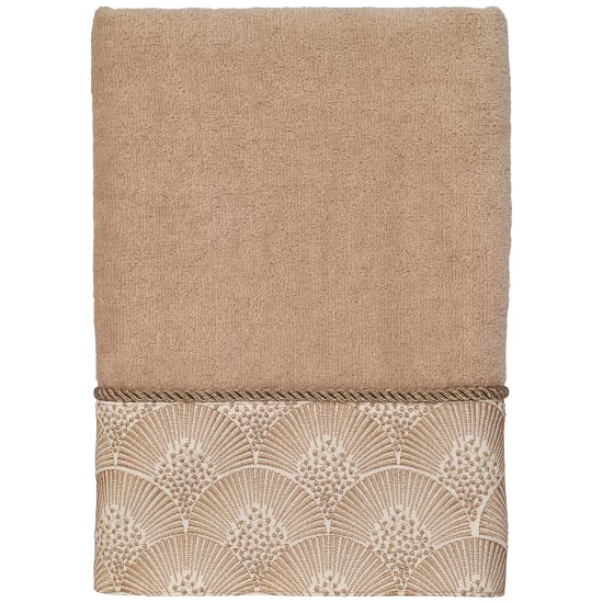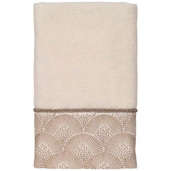 The Avanti Deco Shells Hand Towel features an embroidered band of coordinating shells on a tonal fabric attached to a 100% cotton velour towel. The band is finished with a coordinating rope trim.