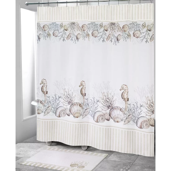The Avanti Destin Rug features an embroidered fan shell, nautilus and coral on a 100% cotton tufted rug. The top and bottom are bordered with beige and white vertical stripes. Imported.