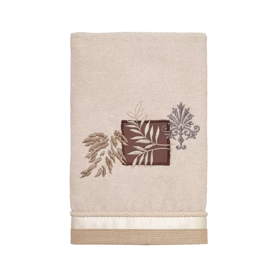 The Avanti Destin Bath Towel features a beautifully embroidered shell and coral design in grey and beige tones on a 100% cotton terry towel. The towel is finished with a beige and white vertical striped border. Imported.