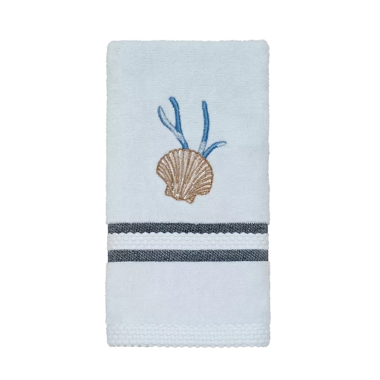 The Avanti Destin Tissue Cover features an intricately detailed seahorse and shell with coral in relief on a white ground. Hand-painted and crafted in durable resin.