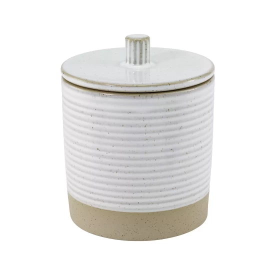 The Avanti Drift Covered Jar features a textured ribbed look with alternating glossy white and linen lines on the body with a solid linen textured matte base. Made out of sand clay with white glaze. Full coordinating bath accessory collection is available.