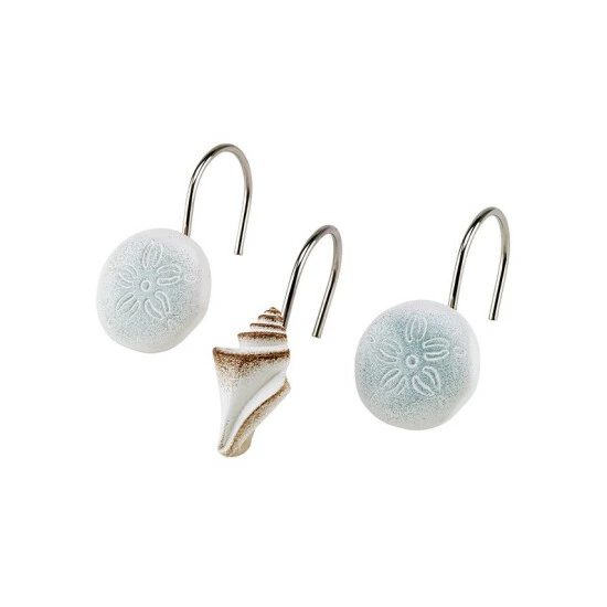 The Farmhouse Shell Shower Curtain Hooks pulls 3 icons from the shower curtain design-conch shell, sand dollar and starfish. Made in durable resin and hand painted. Set of 12, 4 of each design.