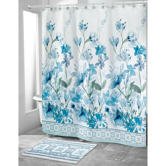 The Avanti Garden View Shower Curtain Collection features a group of spring blooms in shades of light and dark blues with green vines and leaves. This fresh spring scene rendered in a watercolor style will transform your space.