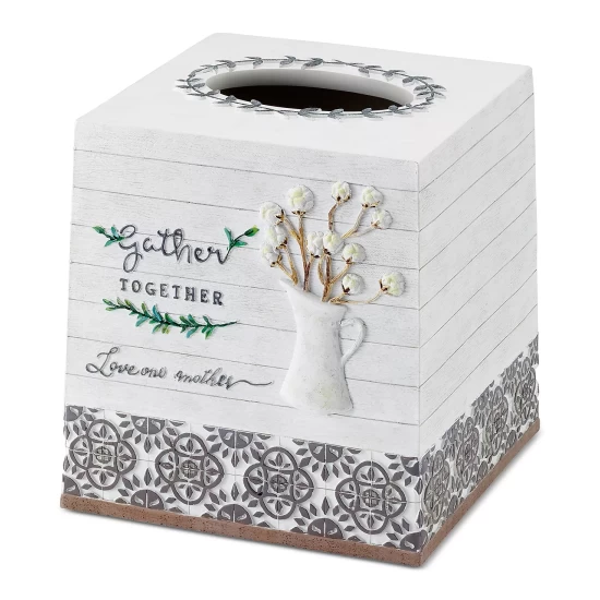 Add some relaxing rustic style to your bathroom with the charming flowers, phrases and faux-wood detailing of this Modern Farmhouse tissue cover from Avanti.