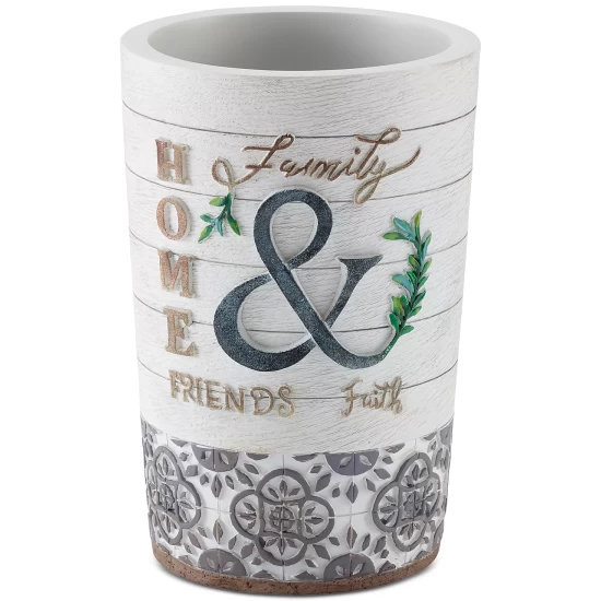 Add some relaxing rustic style to your bathroom with the charming flowers, phrases and faux-wood detailing of this Modern Farmhouse tumbler from Avanti.
