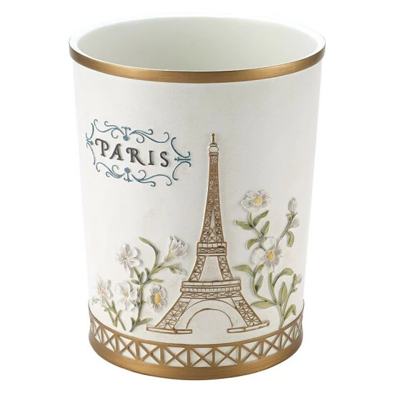 The Avanti Paris Botanique Wastebasket features “Paris” in grey , the Eiffel Towel in gold and flowers in relief in neutral shades on an off-white base. The bottom is bordered with a gold grid pulled from the Eiffel Tower.