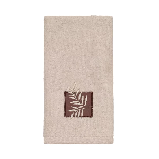 The Avanti Serenity Fingertip Towel features an embroidered leaf motif on a brick red applique on an ivory 100% cotton velour towel.