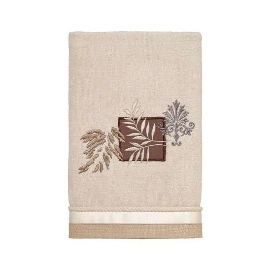 The Avanti Serenity Hand Towel features an embroidered motif of leaves and a crest in green, blue and brick red on an ivory 100% cotton velour towel. The towel is finished with a coordinating fabric border.