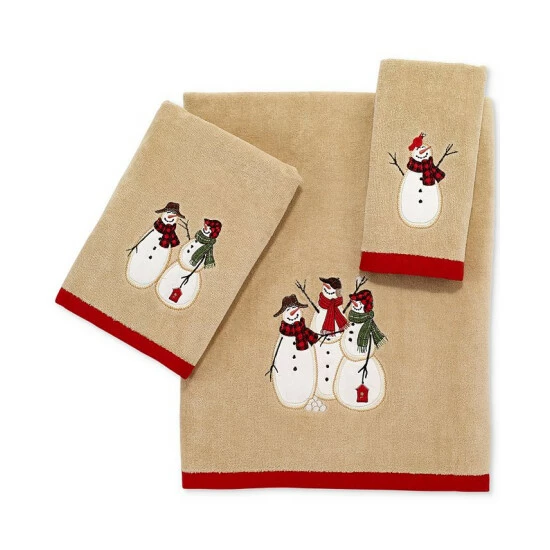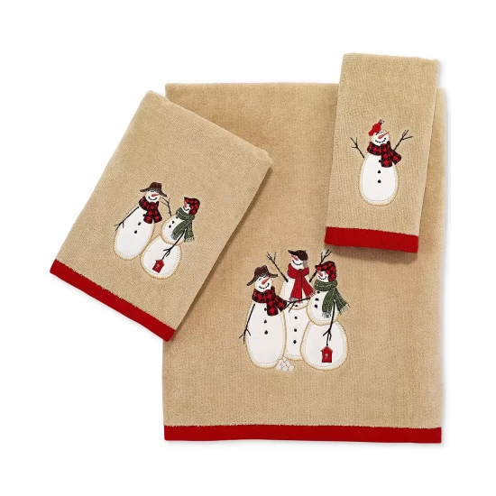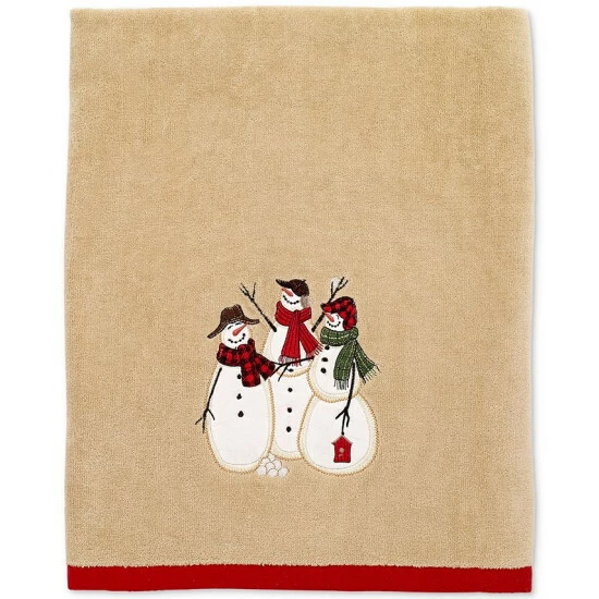 Trim your space for the season with the spirited Snowman Gathering Cotton bath towel by Avanti. This neutral-toned velour piece has an embroidered trio of frosty friends and a red trim that lend a buoyant note to your bath.