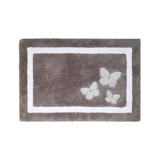The Avanti Yara Rug features a beautifully embroidered white butterfly with grey accents on a 100% cotton tufted grey base with white border.
